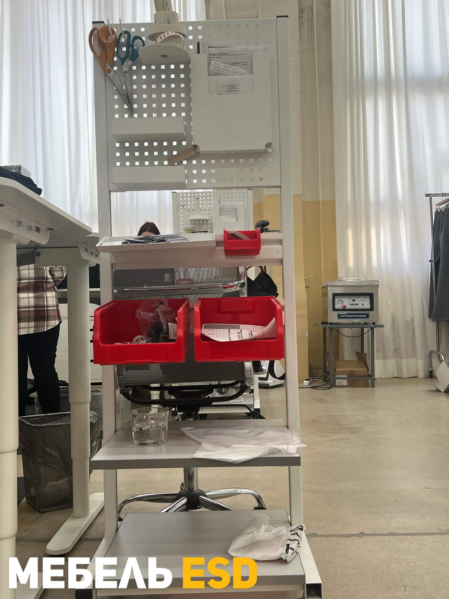 — знак ESD (Electrostatic sensitive device), обозначающий работу с материалами, чувствительными к электростатическому разряду. В комплект поставки антистатической стойки входит набор ESD колес.